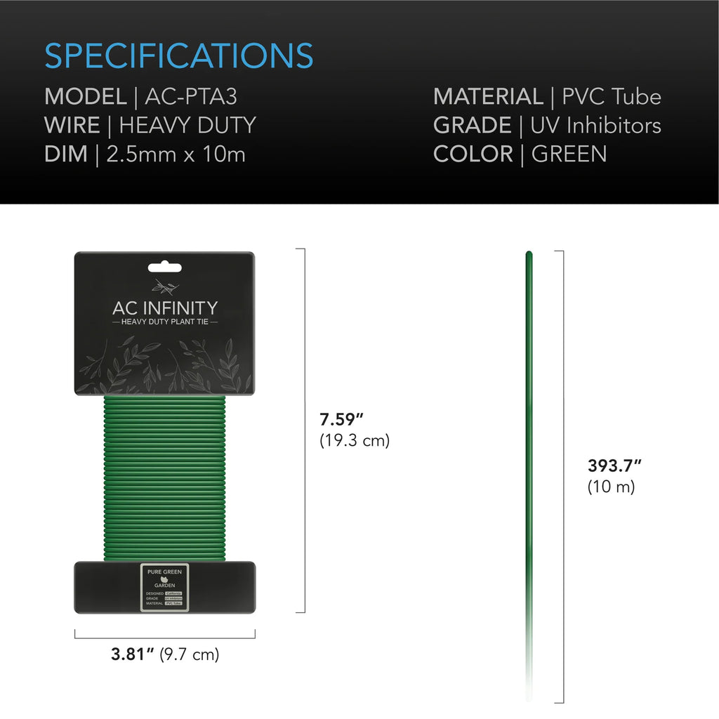 A set of heavy-duty wire fasteners designed to hold plants up together with stakes, grids, posts, and other support systems. Each bundle of green plant ties is made of an iron string core enveloped in a dense, heavy-duty PE plastic that is easy to shape. The rubberized texture ensures that each twist will not come undone and stay wrapped around your plant. In addition, its non-abrasive surface provides cushioned support and handling while not cutting into your plant’s stems. The garden wire ties wrap around the packaging, which allows convenient hanging, for easy unwinding and cutting to your desired length.